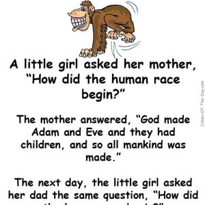 “Mummy, how did the human race begin?” The mother answered, “Well dear, God made Adam and Eve, and they had children, and so all of mankind was…