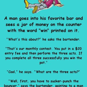 “What’s this about?” he asks the bartender. “That’s our monthly contest. You put in a $20 entry fee and then perform the three acts. If you complete…
