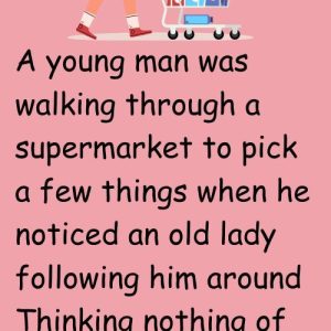 A young man was walking through a supermarket to pick a few things when he noticed an old lady following him around