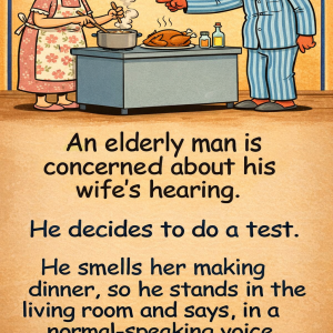An elderly man is concerned about his wife’s hearing. He decides to do a test. He smells her making dinner, so he stands in the living room…