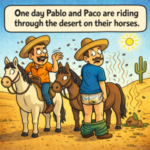 One day Pablo and Paco are riding through the desert on their horses. As they ride along, Pablo smells something horrible. He stops his horse and turns…